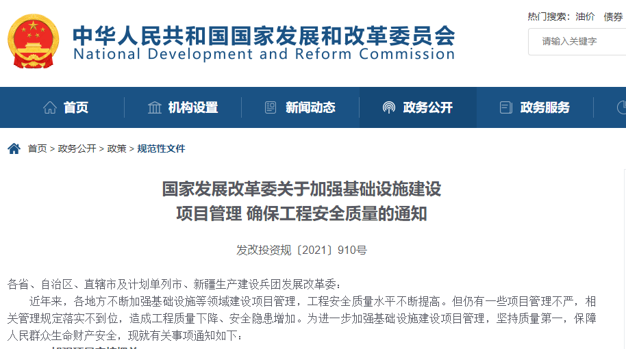 近日,國家發展改革委印發《關于加強基礎設施建設項目管理確保工程安全質量的通知》,重點如下: